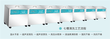 超聲波清洗→超聲波漂洗→高壓水噴淋→浸油煮沸防銹→熱風干燥